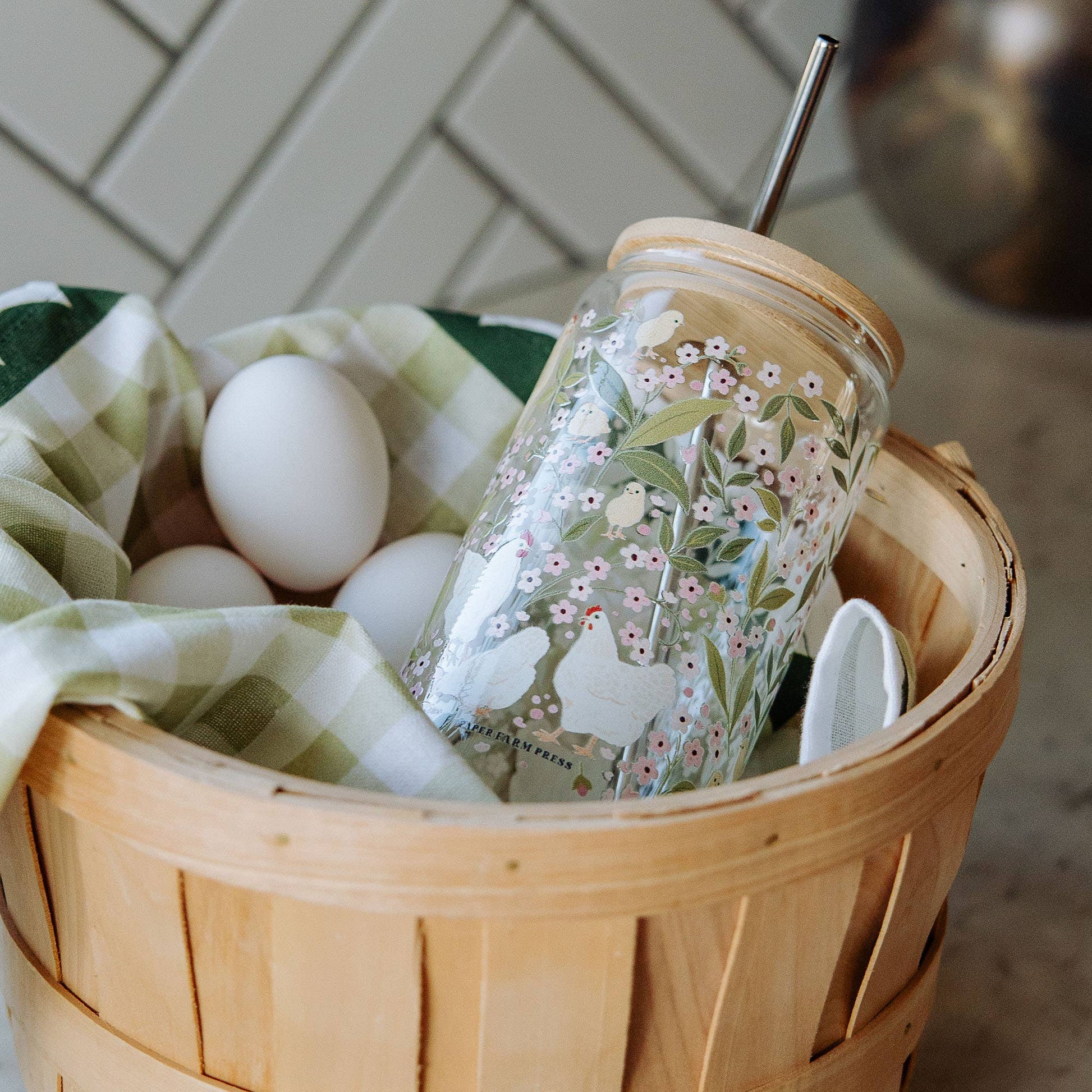 Bring the warmth of the countryside to your table with the Chicken Fields Glass Can. Adorned with whimsical illustrations of chickens and delicate pink wildflowers, this charming glass is perfect for enjoying your favorite beverages with a touch of rustic flair. Whether you’re savoring a steaming cup of morning coffee, refreshing juice from the orchard, or creamy milk for a hearty breakfast, this glass can is perfect for every sip. Features a hand-painted design printed on glass, bamboo lid, and stainless steel straw.