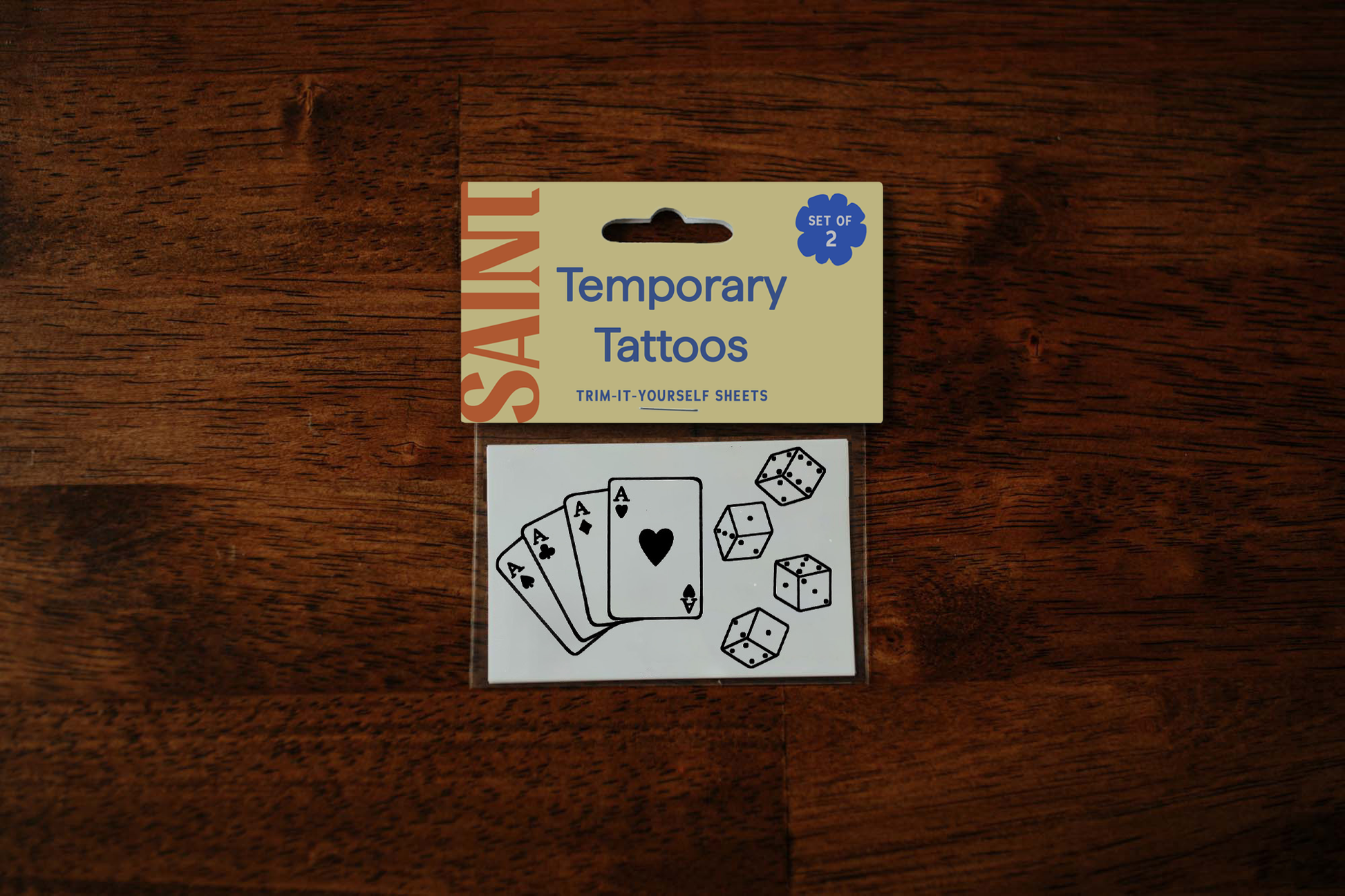Featuring classic playing cards and tumbling dice, this trim-it-yourself tattoo brings a touch of luck and a hint of high-stakes energy.