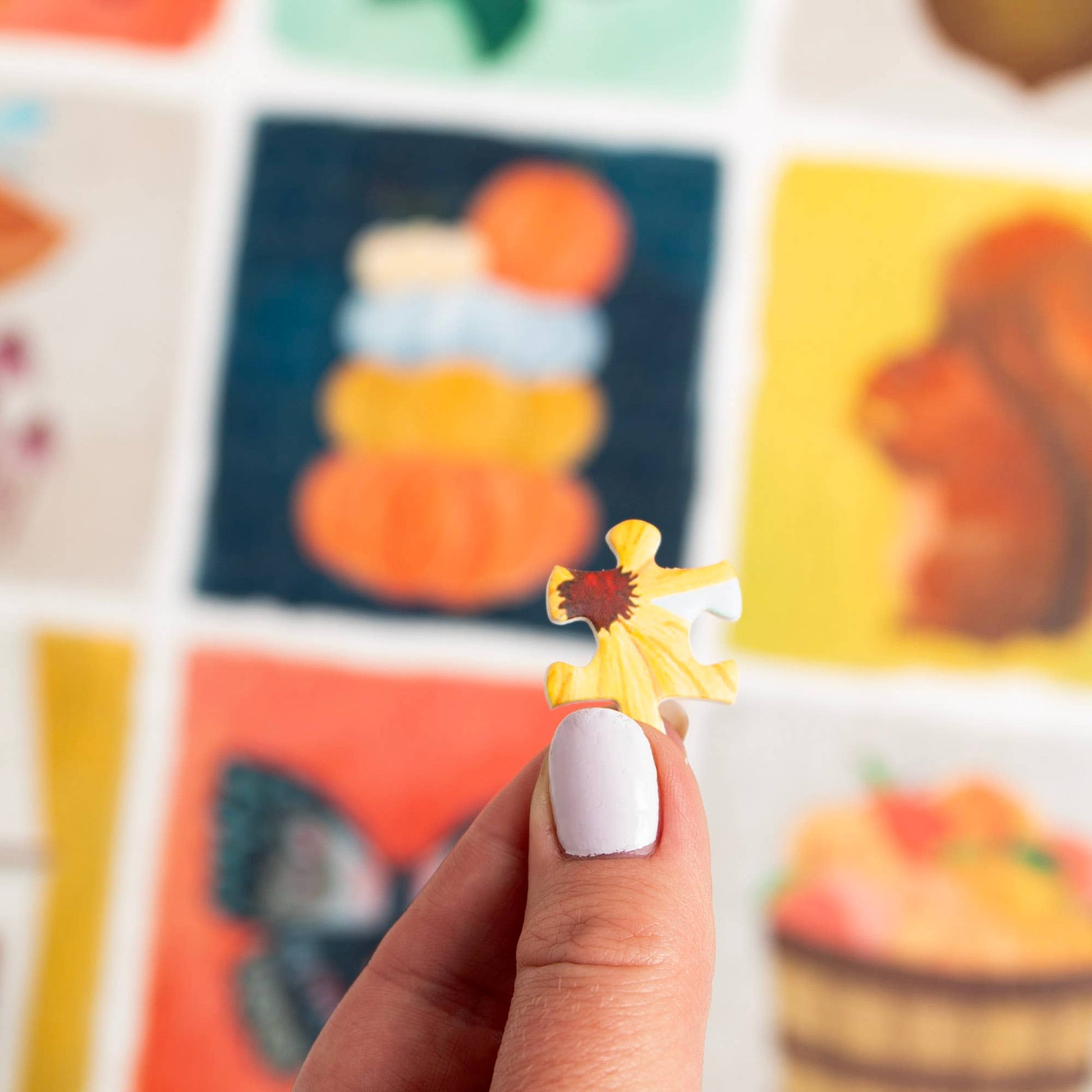 Featuring a variety of hand-painted illustrations, our Fall Grid Puzzle makes a great gift for mom, dad, or a friend or loved one who enjoys the autumn season. From the nature-lover to the cozy homebody—this thoughtful puzzle features one-of-a-kind icons that remind us of life's simple joys, including heirloom corn, a sunflower, acorn, mushrooms, pumpkins, a squirel, a cozy fireplace, butterfly, barrel of apples, a golden leaf, feather, and mug of hot cocoa.