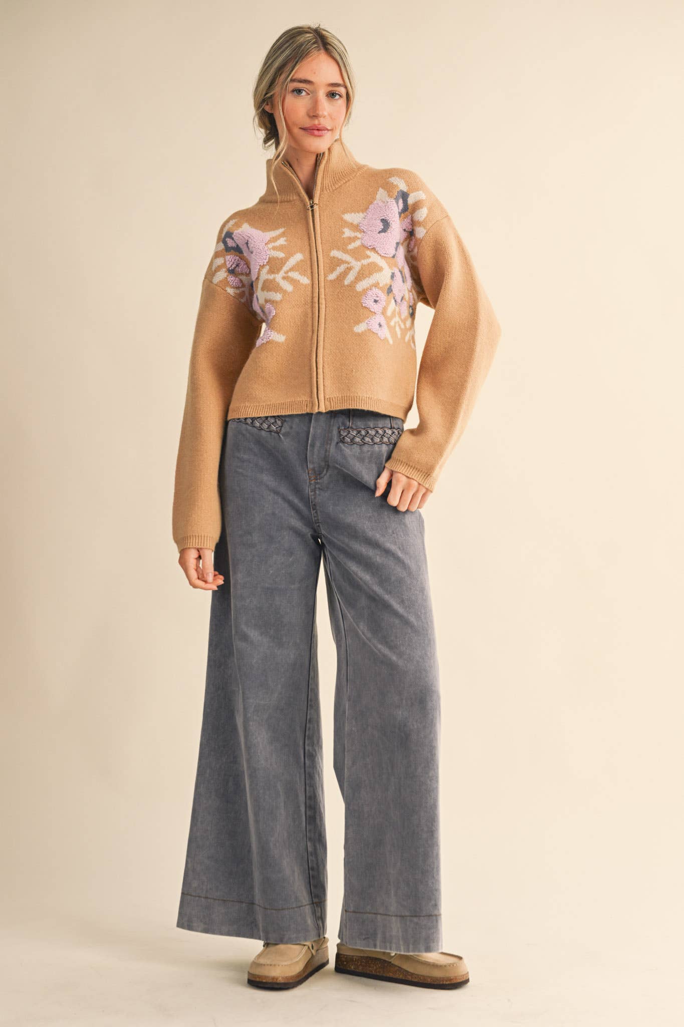 This Floral Zip Up Sweater Cardigan features a ribbed stand collar, drop shoulder long puff sleeves, and ribbed knit sleeve cuffs and hem. Model is 5' 7" 30-24-34.5 and wears a S.