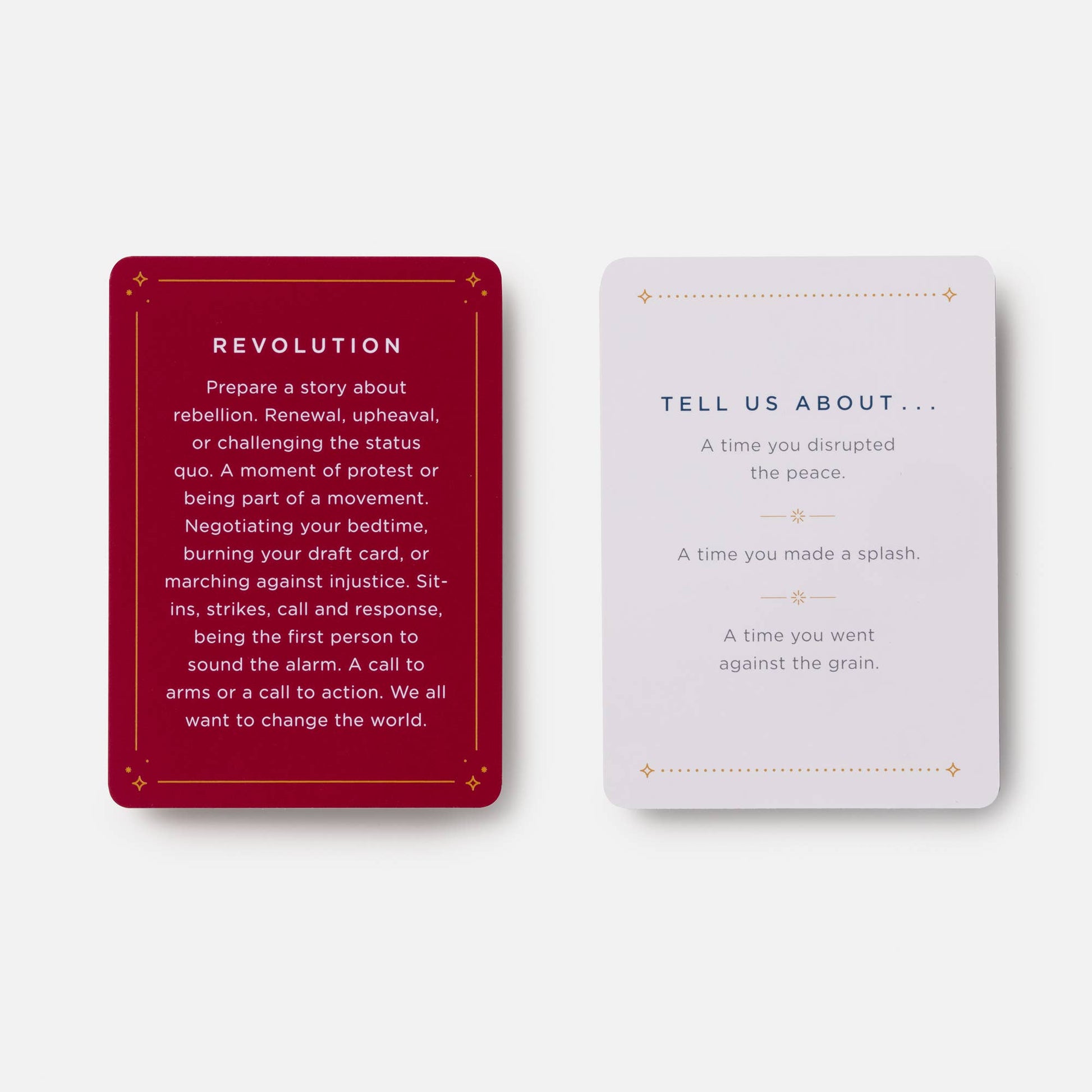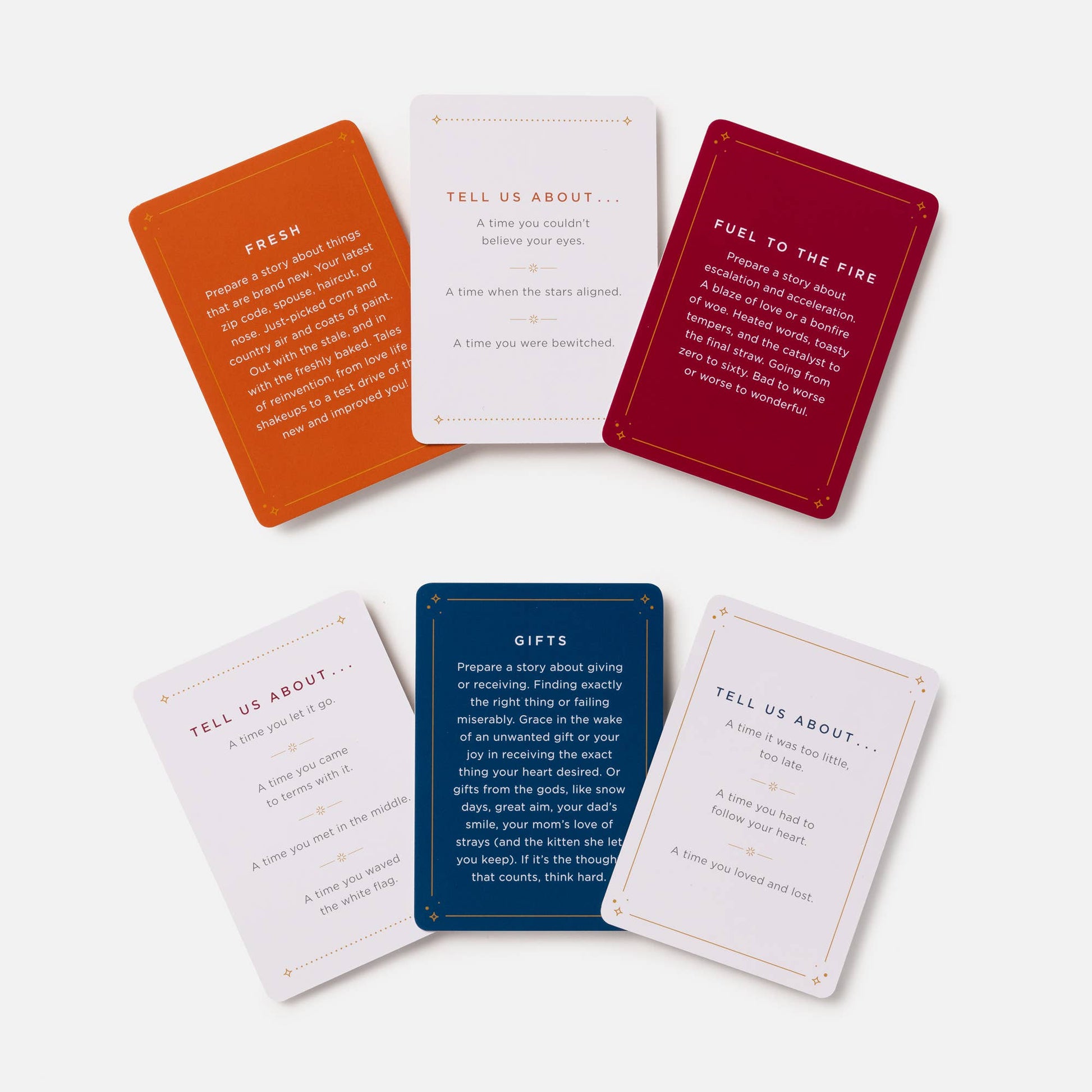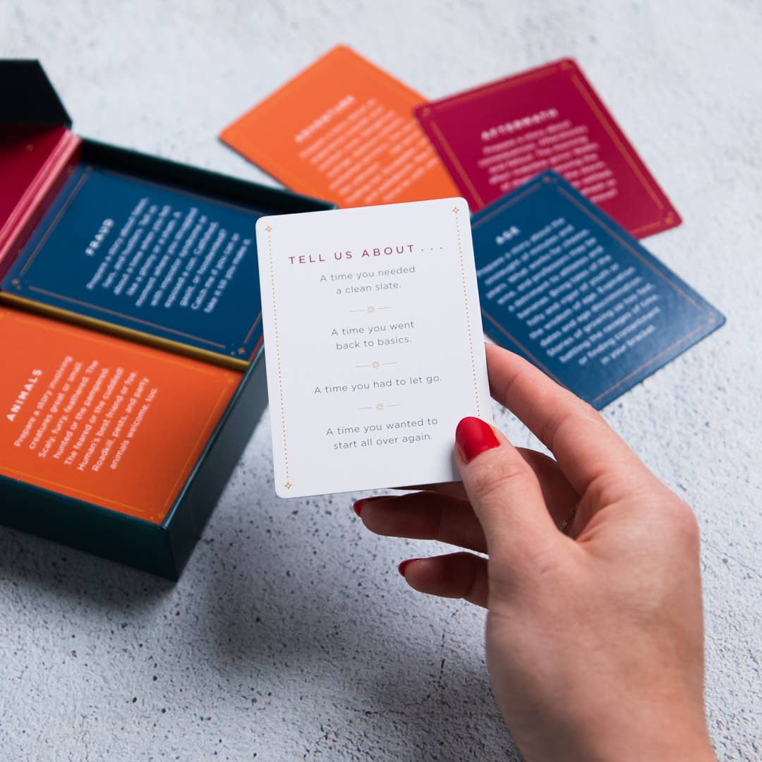 • All In: Pull a card and ask everyone at the table to share a story based on the theme and prompts.