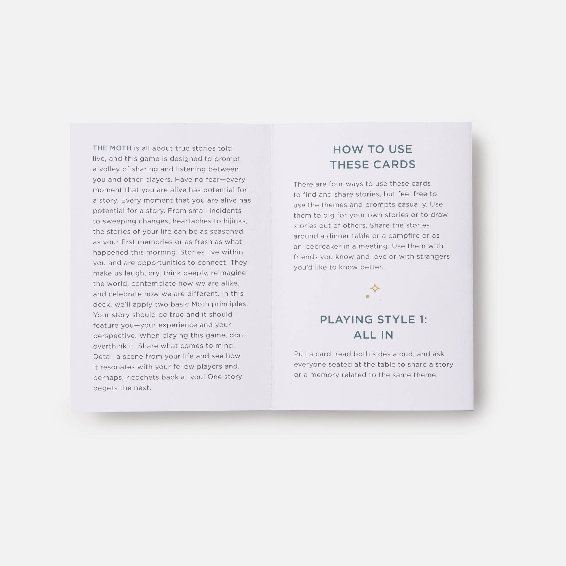 "Since 1997, The Moth has engaged thousands of fans through their celebrated live shows, workshops, and The Moth Radio Hour and The Moth Podcast. A Game of Storytelling features 100 themes, including Love Hurts, Mama Rules, Busted, Fuel to the Fire, Lifelines, Hot Mess, Chemistry, Duped, and many more. Over 300 additional prompts offer riffs on the themes to spark your stories.